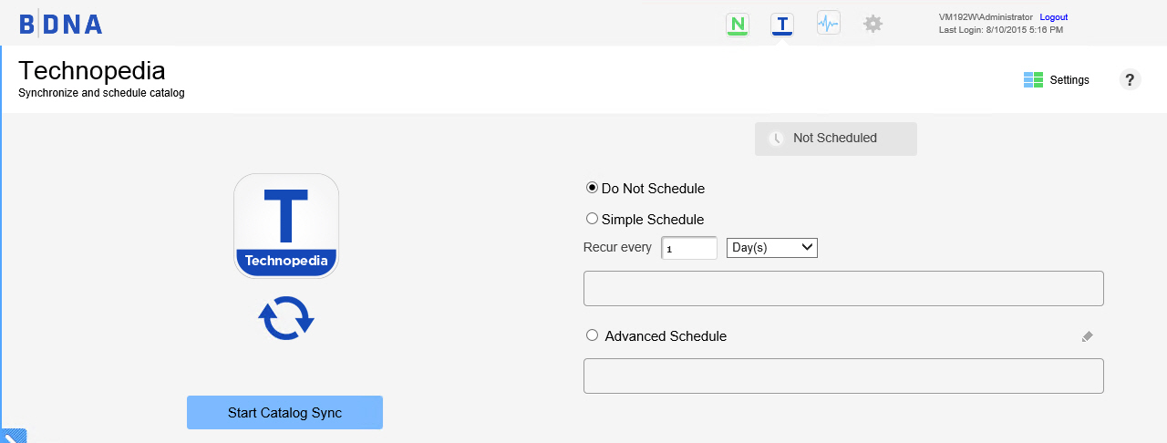 Click the Technopedia Catalog icon, located in the upper-right corner of the Administration Console. The Technopedia Synchronize and Schedule Catalog page opens and shows the time of the last catalog synchronization (see Technopedia Synchronize and Schedule Catalog page).