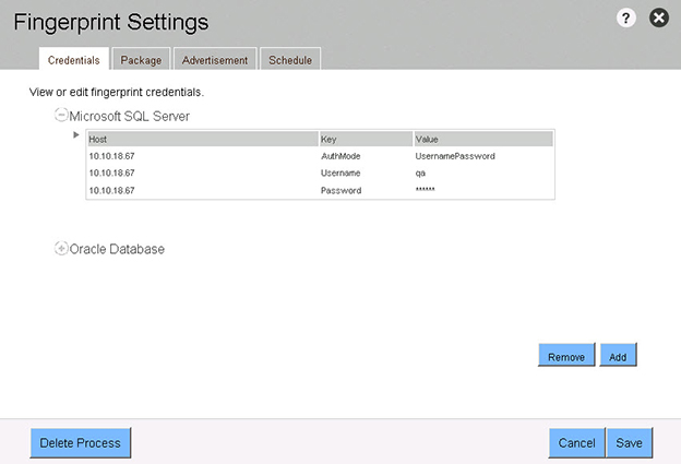 Process settings for a Fingerprints process were organized under Credentials, Package, Advertisement, and Schedule tabs.