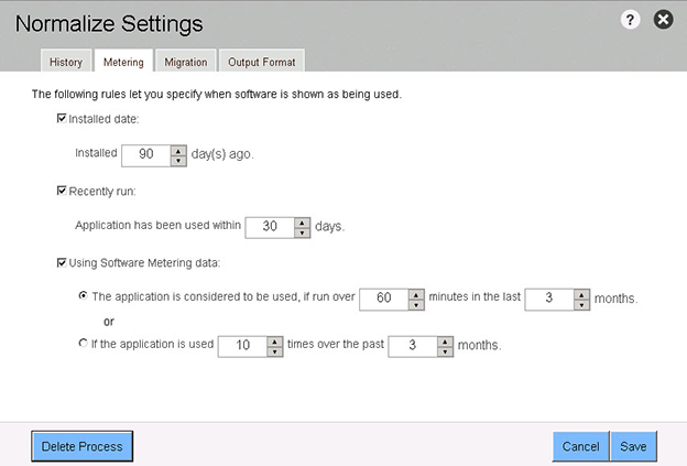 Use this screen to view and edit when software is shown as being used. Metering options are dependent on the IT Discovery Tool. If an IT Discovery tool does not provide metering information, the option will still be visible in the UI, but will not be available for use.