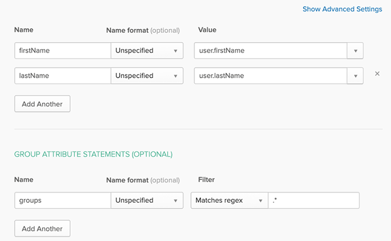 Note:Choose any desired filter to limit the groups that will be synchronized to Flexera One. Use the Matches regex = .* filter to send all Okta group memberships.
