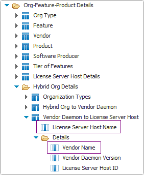 To display a list of license servers for the selected hybrid organizational structure, you can add a value prompt that cascades from the vendor-selection prompt. (Hybrid aggregation is based upon vendor selection.***) The query for this prompt uses two query subjects as data items: License Server Host Name and Vendor Name. These query subjects are located in the Hybrid Org Details folder in the Org-Feature-Product Details namespace.