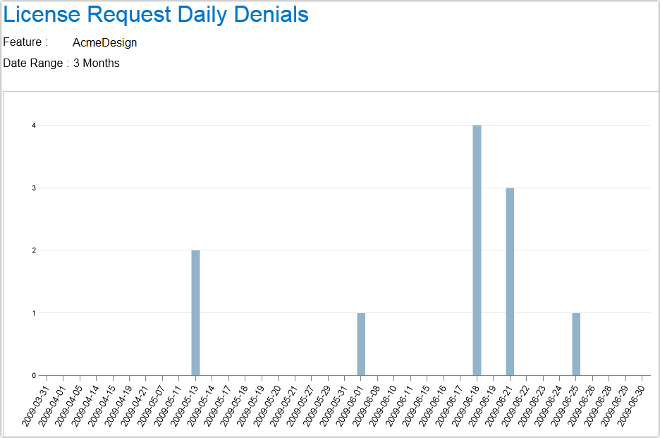 The License Request Daily Denials report shows the number of ultimate denials per day, for a given feature. In this report, you can do the following: