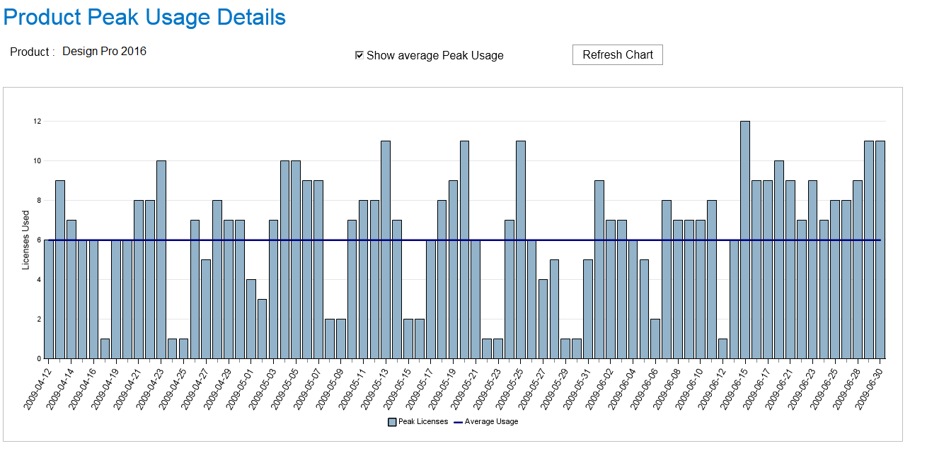 The Product Peak Usage Details report presents a column graph that shows the daily peak number of licenses used for the reporting period. This enables you to see the variation in peak license usage from day to day, for the selected product.