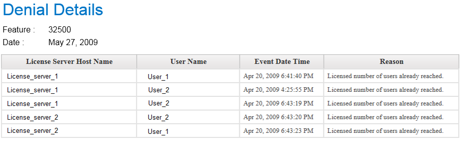 The Denial Details report provides details about each denial that occurred for a feature on a given date. It provides the following information: