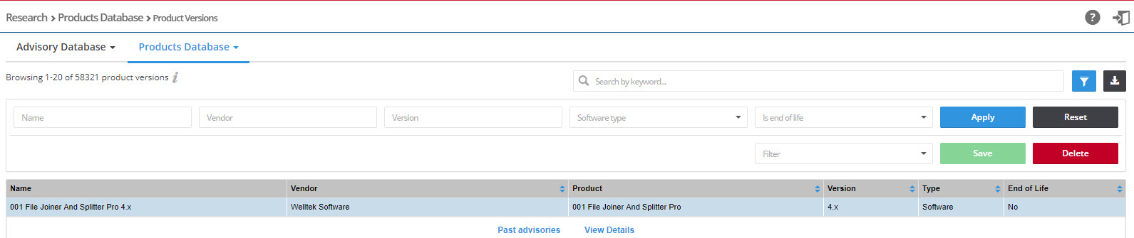 Click to filter the results by Name, Vendor, Version, Software type, (Software/Operating system), and Is end of life (No/Yes). |
