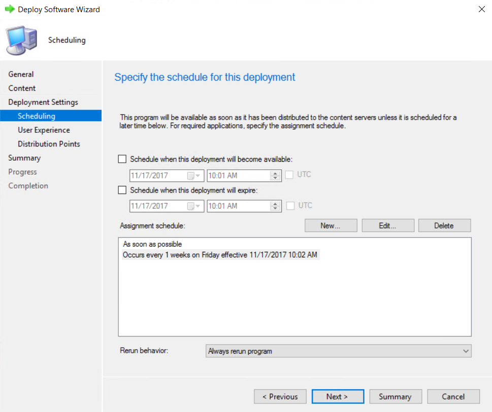 5. | On the Scheduling page, in the Assignment schedule click New. Schedule a scan for as soon as possible and create a weekly scanning schedule. Also configure the Rerun behavior deployment to Always rerun program. |