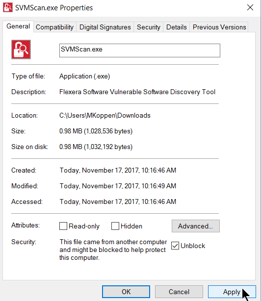 Note:Make sure to right click on the .exe in the deployment share to “Unblock” it. Click Apply > OK.