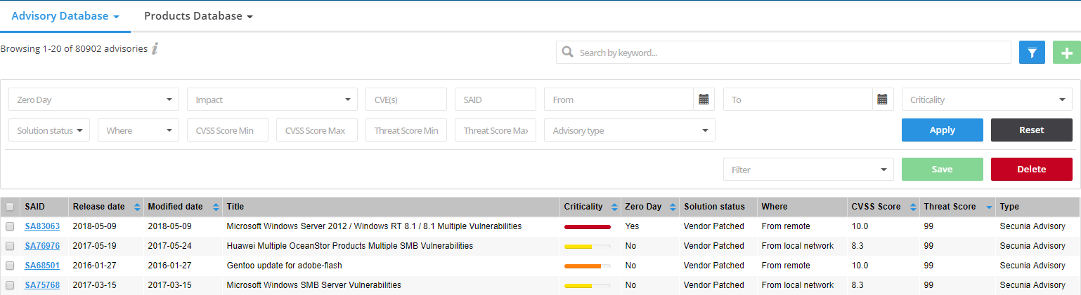 | • | To filter the Advisories by Threat Score minimum and maximum values, click |