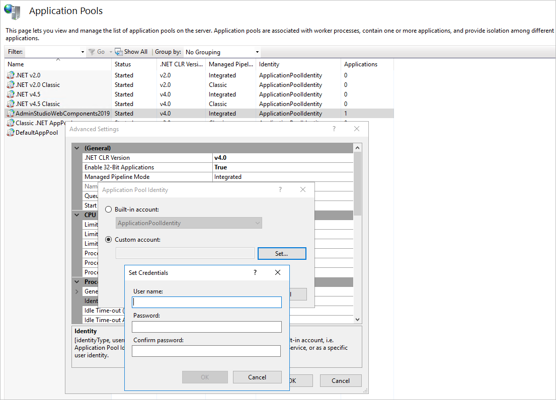 | 6. | Click OK on the Set Credentials, Application Pool Identity, and Advanced Settings dialog panels. |