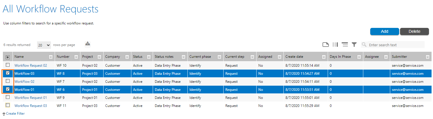In Workflow Manager 2020 Update 1, Multiple Workflow requests can be deleted by selecting the multiple rows in the page.